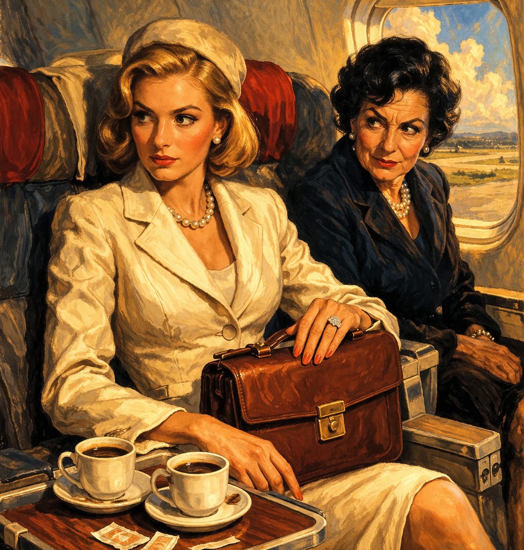 After the tall, dark-haired woman lifted the carry-on bag into the overhead compartment, the younger blonde in the aisle seat moved her knees so the tall lady could squeeze past to sit by the window. The seat between them was empty. Outside, the tarmac baked in the noonday sun.