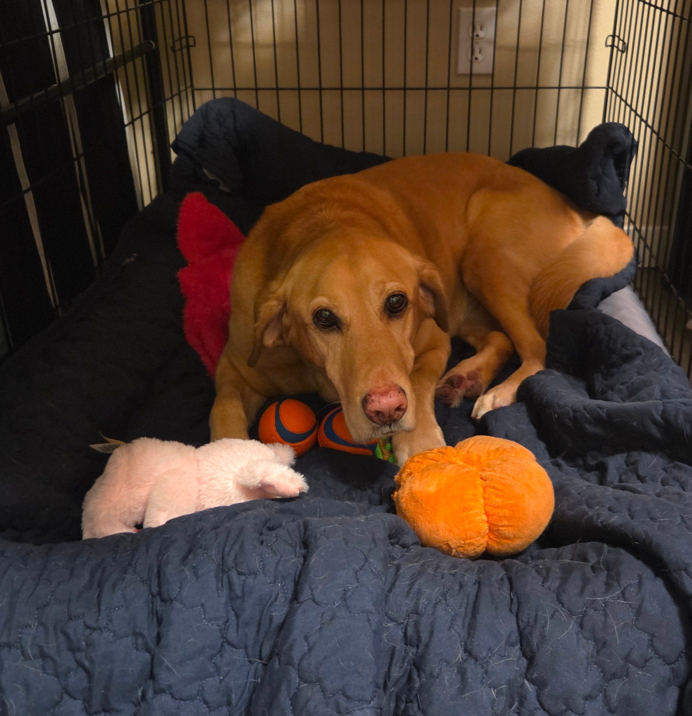 Arya did her part to pack. She gathered all her toys into her crate.